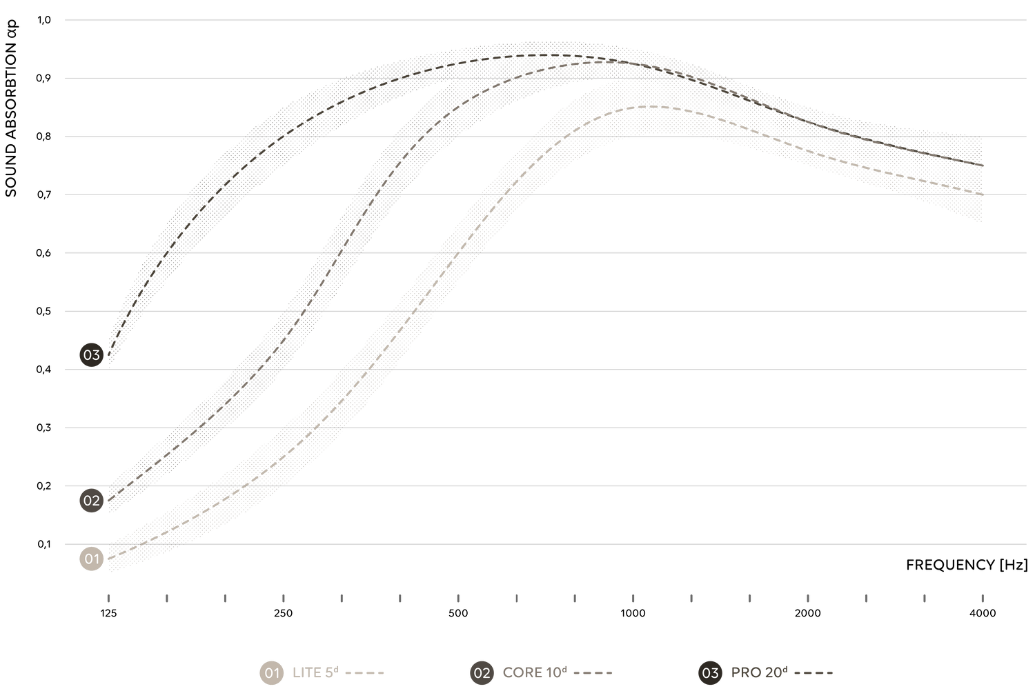 The absorption coefficients presented in the graph are derived from theoretical calculations based on material properties, panel design, and established acoustic principles. Actual performance may vary depending on installation conditions, room acoustics, and other environmental factors. For precise measurements tailored to your specific application, professional acoustic testing is recommended.